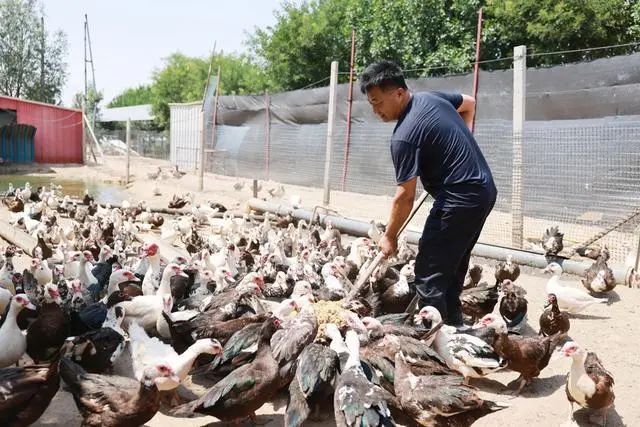 ↑6月18日,在廣宗縣核桃園鎮(zhèn)小辛莊村,飼養(yǎng)人員在給非洲雁投放飼料。