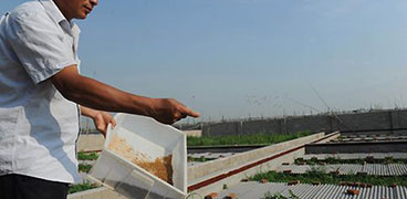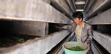5月19日,在河北省故城縣坊莊鄉(xiāng)吳梧茂土元養(yǎng)殖基地,工人正在展示一捧土元?! ⊥猎追Q土鱉蟲,具有舒筋、活血、化淤功效的中藥材。近年來,河北省故城縣坊莊鄉(xiāng)吳梧茂村與中