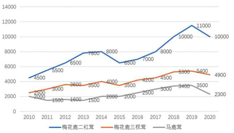 圖1- 2010—2020 年中國(guó)梅花鹿、馬鹿鹿茸市場(chǎng)價(jià)格變化(干茸,元/kg)