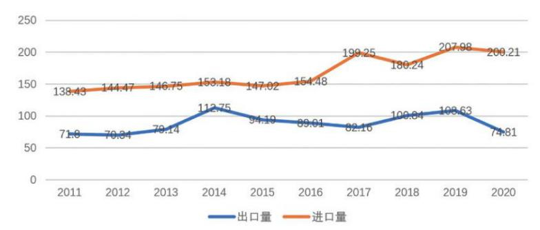 圖4- 2011—2020 年鹿茸及其粉末進(jìn)出口數(shù)量變化(干茸,t)