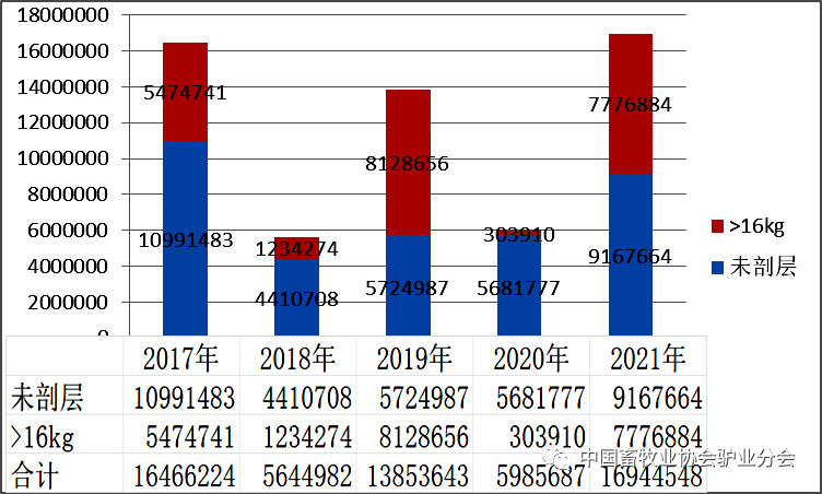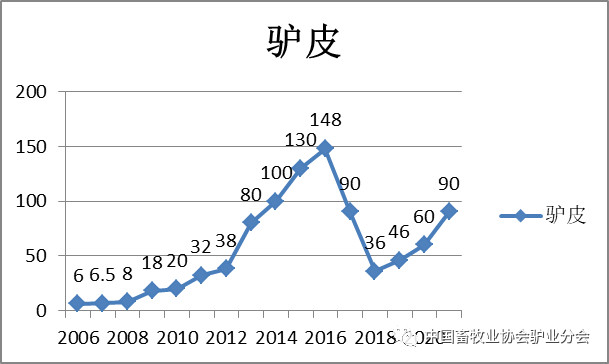 前幾年由于我國(guó)驢皮價(jià)格高漲,大量驢皮進(jìn)入我國(guó)。根據(jù)海關(guān)數(shù)據(jù),我國(guó)進(jìn)口馬科動(dòng)物皮主要有2種規(guī)格,一是未剖層的整張馬科動(dòng)物皮,二是重量>16kg的整張馬科動(dòng)物皮。2017年到2021年五年共進(jìn)口58895噸,其中2017年進(jìn)口16446噸。由于進(jìn)口驢皮成本低,進(jìn)口規(guī)模大,我國(guó)驢皮價(jià)格大幅下跌,對(duì)驢產(chǎn)業(yè)沖擊非常大。2017年,有13個(gè)國(guó)家注冊(cè)驢皮加工并向我國(guó)出口,而這些國(guó)家注冊(cè)驢皮的加工能力遠(yuǎn)超我國(guó)實(shí)際需要。受阿膠銷量下降和疫情影響,2018年到2020年進(jìn)口25484噸,年均8494噸,特別是2020年因“新冠”疫情和“非洲馬瘟”疫情影響,驢皮進(jìn)口一度處于停滯狀態(tài),使得驢皮庫(kù)存量減少,收購(gòu)價(jià)格開始上漲。