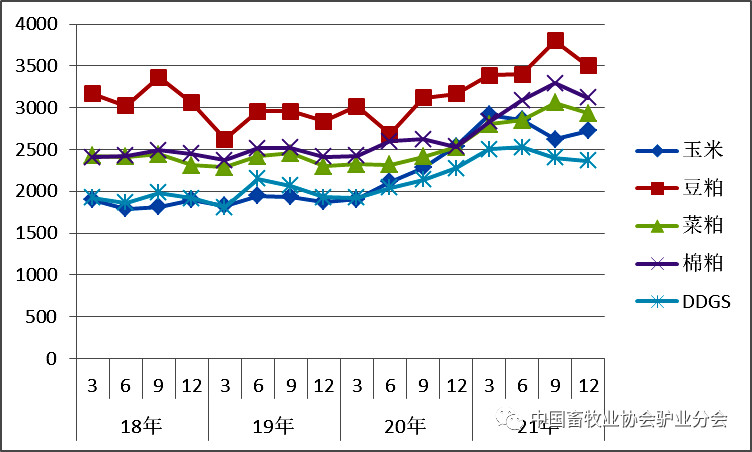 在精料價(jià)格方面,玉米、豆粕、菜粕、棉粕及DDGS等為主的原料在2021年都出現(xiàn)大幅上漲。雖然在2021年12月略有回調(diào),但仍高位震蕩;在玉米價(jià)格方面,2018年價(jià)格1 850元/噸,2019年1 896元/噸,2020年2 209元/噸,2021年2 778元/噸,2021年比上年上漲25.8%;在豆粕價(jià)格方面,2018年豆粕價(jià)格為3 155元/噸,2019年2 845元/噸,2020年2 996元/噸,2021年3 522元/噸,2021年比2020年上漲17.6%。在預(yù)混料價(jià)格方面,2%育肥驢、2%青年驢和2%母驢3種預(yù)混料價(jià)格基本沒有變化。