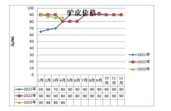 2017年5月從160元/KG開始下降,2018年10月到2020年9月在40-50元/KG低位徘徊,通過幾年調(diào)整,阿膠生產(chǎn)、銷售逐步恢復(fù)良性循環(huán),驢皮、阿膠庫存進(jìn)入合理水平,阿膠生產(chǎn)企業(yè)對驢皮的需求增加。2021年5月份后,除個(gè)別月份外稍降,一直維持在90元左右。2023年2月開始驢皮價(jià)格小幅降低。