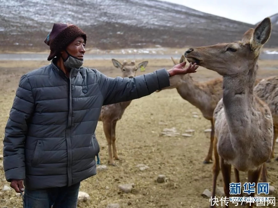 甘德縣崗龍鄉(xiāng)恰不將村生態(tài)畜牧業(yè)專(zhuān)業(yè)合作社村民在鹿場(chǎng)喂鹿。