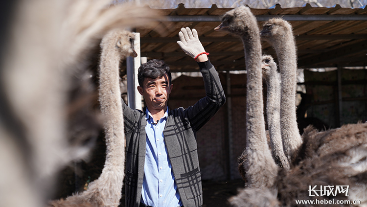 鴕鳥養(yǎng)殖專業(yè)戶張清峰在鳥棚中與鴕鳥互動。長城網(wǎng)記者 馮碩 攝