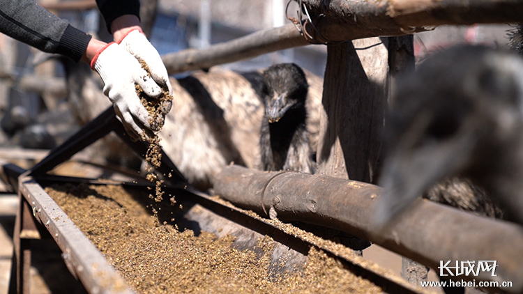 鴕鳥養(yǎng)殖專業(yè)戶張清峰給鴕鳥喂草料。長城網(wǎng)記者 馮碩 攝