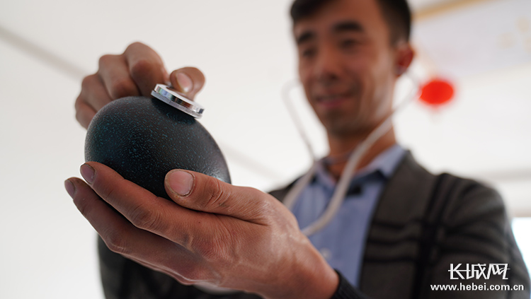 鴕鳥養(yǎng)殖專業(yè)戶張清峰用聽診器聽診鴕鳥蛋。長城網(wǎng)記者 馮碩 攝