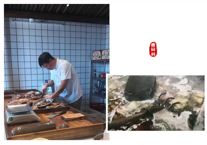 1999年,魏同利開了現(xiàn)在的驢肉百年老店。他每天凌晨4點(diǎn)開始,撈出由老湯熬煎一宿的驢肉分類加工,調(diào)配好由26味中草藥組成的鹵料,再進(jìn)行新一批驢肉的熬煮,早上鹵煮,下午小火煨煮,晚上長(zhǎng)燜,3口直徑1.6米以上的大鍋,循環(huán)使用,日日年年如此。