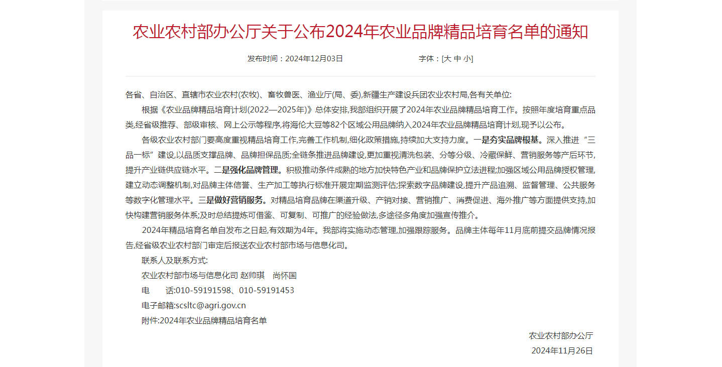 2024年精品培育名單自發(fā)布之日起,有效期為4年。我部將實施動態(tài)管理,加強跟蹤服務。品牌主體每年11月底前提交品牌情況報告,經(jīng)省級農(nóng)業(yè)農(nóng)村部門審定后報送農(nóng)業(yè)農(nóng)村部市場與信息化司。