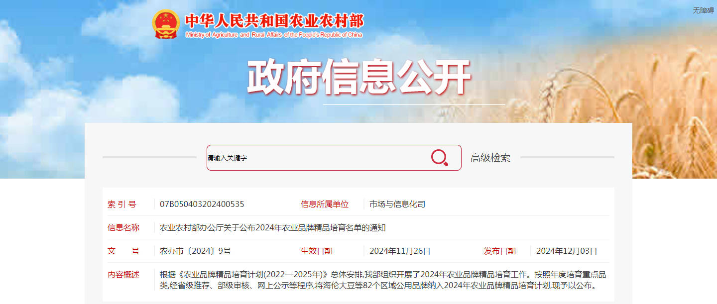 根據(jù)《農(nóng)業(yè)品牌精品培育計劃(2022—2025年)》總體安排,我部組織開展了2024年農(nóng)業(yè)品牌精品培育工作。按照年度培育重點品類,經(jīng)省級推薦、部級審核、網(wǎng)上公示等程序,將海倫大豆等82個區(qū)域公用品牌納入2024年農(nóng)業(yè)品牌精品培育計劃,現(xiàn)予以公布。