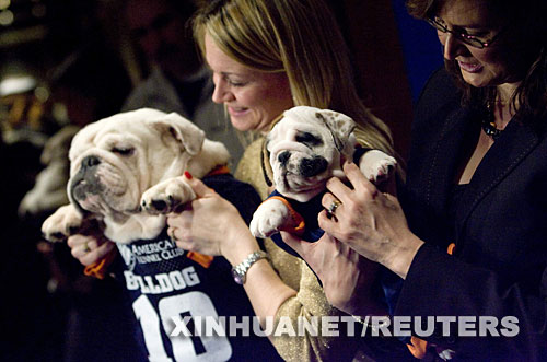 1月16日,在美國紐約舉行的新聞發(fā)布會上,工作人員展示兩只斗牛犬。新華社/路透