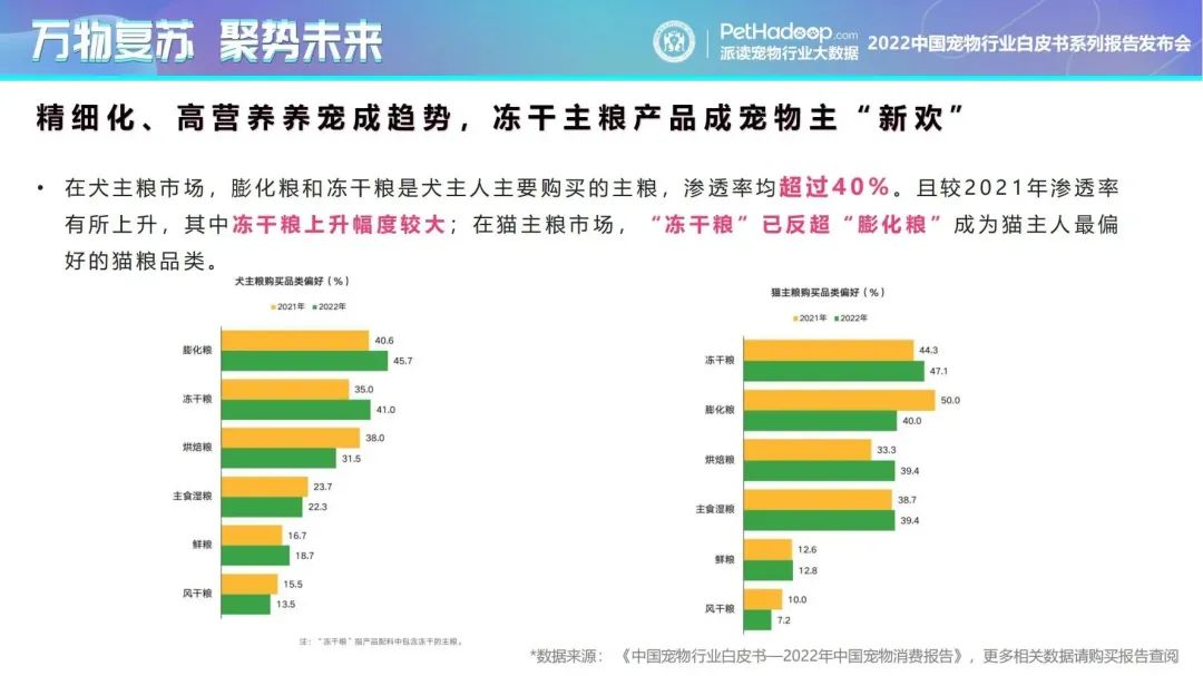 在犬主糧市場,膨化糧和凍干糧是犬主人主要購買的主糧,滲透率均超過40%。且較2021年滲透率有所上升,其中凍干糧上升幅度較大;在主糧市場,“凍干糧”則已經(jīng)反超“膨化糧”成為貓主人最偏好的貓糧品類,與2021年相比,貓主人更加注重主糧營養(yǎng),“凍干糧”“烘焙糧”的滲透率大幅上升,其中“凍干糧”已反超“膨化糧”,市場占比47.1%,成為貓主人主要購買的主糧類型。