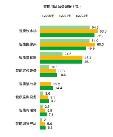 “智能飲水機(jī)”“智能攝像頭”偏好度下降,?智能飲水機(jī)”“智能攝像頭”“智能喂食器”,作為寵物智能用品三大品類,其滲透率最高,呈現(xiàn)與其他品類斷層狀態(tài)。?但與2021年相比,“智能飲水機(jī)”“智能攝像頭”偏好度有所下降。相反,“智能定位設(shè)備""智能貓砂盆""健康監(jiān)測設(shè)備"等均小幅上升。