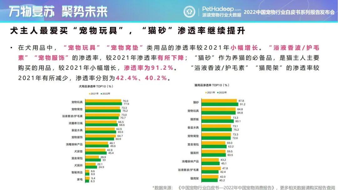 此外,寵物用品市場滲透率較2021年小幅上升,滲透率為80.4%。寵物訓(xùn)練、托運(yùn)、樂園等7個品類的滲透率則均低于10%。同時,今年的報告還新增了兩個“寵物出行”這一板塊,滲透率為14.2%。
