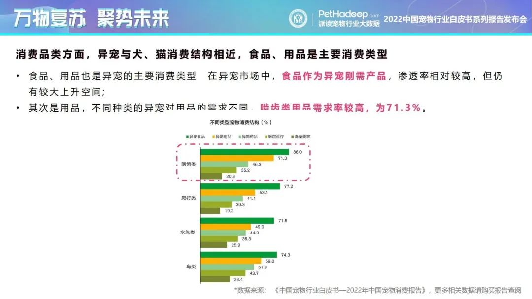 在異寵市場中,食品作為異寵剛需產(chǎn)品,滲透率相對較高,但仍有較大上升空間。其次是用品,不同種類的異寵對用品的需求不同,嚙齒類用品需求率較高,為71.3%。