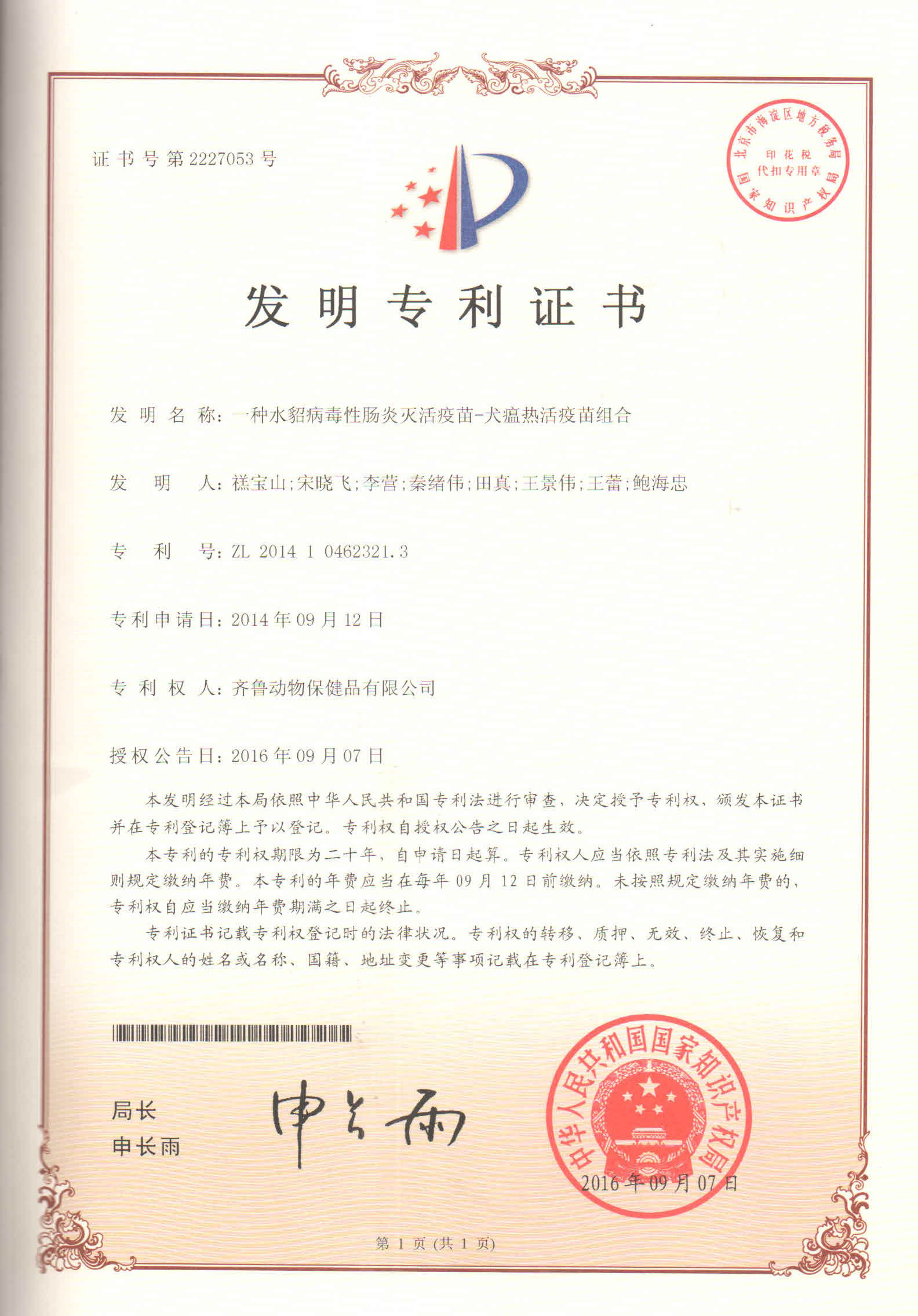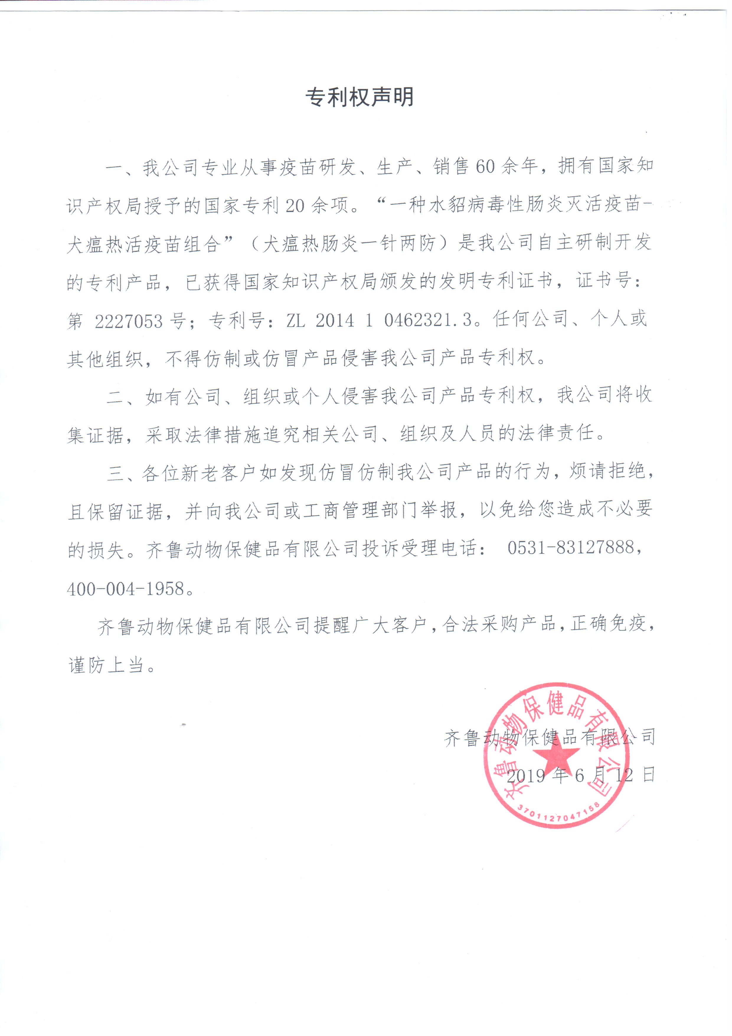 一、 我公司專業(yè)從事疫苗研發(fā)、生產(chǎn)、銷售60余年,擁有國家知識產(chǎn)權(quán)局授予的國家專利20余項。“一種水貂病毒性腸炎滅活疫苗-犬瘟熱活疫苗組合”(犬瘟熱腸炎一針兩防)是我公司自主研制開發(fā)的專利產(chǎn)品,已獲得國家知識產(chǎn)權(quán)局頒發(fā)的發(fā)明專利證書,證書號:第2227053號;專利號: ZL 2014 1 0462321.3。 任何公司、個人或其他組織,不得仿制或仿冒產(chǎn)品侵害我公司產(chǎn)品專利權(quán)。