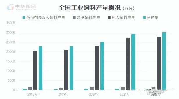 2022年全國工業(yè)飼料總產(chǎn)量首次突破3億噸,達30223.4萬噸,比上年增長3%。
