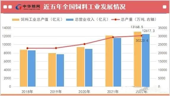 2022年全國飼料工業(yè)總產(chǎn)值13168.5億元,比上年增長7.6%;總營業(yè)收入12617.3億元,增長8%。