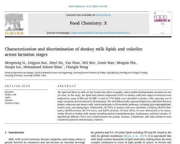 近日,聊城大學聊城毛驢高效繁育與生態(tài)飼養(yǎng)研究院王長法教授團隊在國際著名期刊《Food Chemistry X》(食品化學X)(IF2024=6.50,中科院SCI期刊分區(qū)1區(qū))在線發(fā)表題目為《Characterization and discrimination of donkey milk lipids and volatiles across lactation stages》(驢乳脂質(zhì)和揮發(fā)性物質(zhì)在泌乳階段的特征和鑒別)的研究論文。