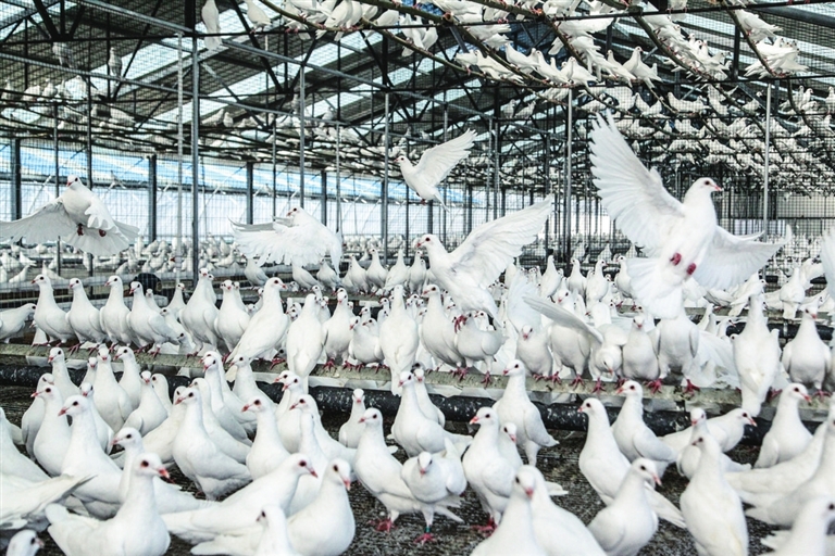 在天成鴿業(yè)的帶動下,如今在舞鋼市,小鴿子已“長”成大產(chǎn)業(yè)。截至目前,據(jù)不完全統(tǒng)計,該市養(yǎng)鴿特色產(chǎn)業(yè)已覆蓋10個鄉(xiāng)(鎮(zhèn)、街道)147個行政村,有天成鴿業(yè)、物華天寶鴿業(yè)、舞彩鴿業(yè)、翔躍鴿業(yè)等22家養(yǎng)鴿企業(yè)和8家養(yǎng)鴿合作社,存欄種鴿110萬對以上,年繁育種鴿60萬對、出欄乳鴿1800萬只、生產(chǎn)鴿蛋1200萬枚以上,鴿業(yè)年產(chǎn)值近2.89億元。