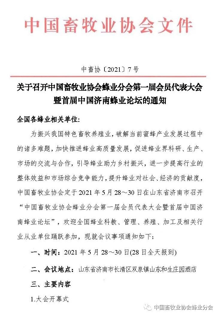 為振興我國(guó)特色畜牧養(yǎng)殖業(yè),破解當(dāng)前蜜蜂產(chǎn)業(yè)發(fā)展過(guò)程中的諸多難題,加快推進(jìn)蜂業(yè)高質(zhì)量發(fā)展,促進(jìn)蜂業(yè)界科研、生產(chǎn)、市場(chǎng)的交流與合作,引導(dǎo)蜂業(yè)助力鄉(xiāng)村振興,進(jìn)一步提高行業(yè)的整體效益和市場(chǎng)綜合競(jìng)爭(zhēng)能力,提升蜂業(yè)對(duì)社會(huì)、經(jīng)濟(jì)的貢獻(xiàn)度,中國(guó)畜牧業(yè)協(xié)會(huì)定于2021年5月28~30日在山東省濟(jì)南市長(zhǎng)清區(qū)雙泉鎮(zhèn)山東和生莊園酒召開(kāi)“中國(guó)畜牧業(yè)協(xié)會(huì)蜂業(yè)分會(huì)第一屆會(huì)員代表大會(huì)暨首屆中國(guó)濟(jì)南蜂業(yè)論壇”,歡迎全國(guó)蜂業(yè)科教、管理、養(yǎng)殖、加工及相關(guān)行業(yè)從業(yè)單位踴躍參加。
