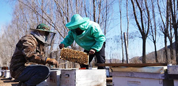 2022年3月1日,在河北省遵化市娘娘莊鄉(xiāng)鼎珍養(yǎng)蜂專業(yè)合作社內(nèi),蜂農(nóng)正在檢查蜂群生長情況。河北省遵化市娘娘莊鄉(xiāng)因地制宜,通過“合作社+農(nóng)戶”的模式,積極發(fā)展蜜蜂