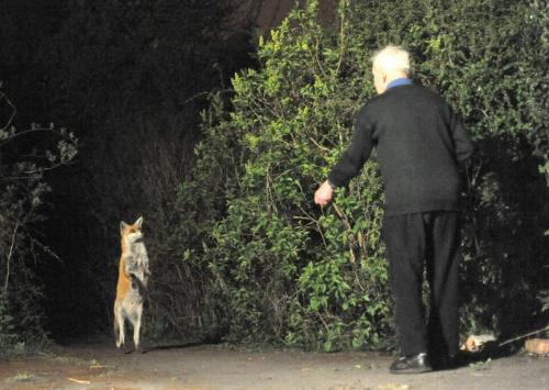這只狐貍和它的狐貍家族每晚在理查德·拉維爾的花園表演如此絕技。拉維爾是英國一名退休的家庭醫(yī)生,他用火雞塊和火腿成功訓(xùn)練狐貍站起來,這讓動物專家驚詫不已?,F(xiàn)在,每晚多達(dá)7只狐貍會溜到他的家園外等待他打開后門。它們和寵物狗一樣溫順,在他的指揮下站得筆直,熟練地抓住他拋起來的食品。它們已經(jīng)習(xí)慣了這餐美食,以致如果他外出一天它們會坐在他的車道上耐心地等待,一直到他回家。