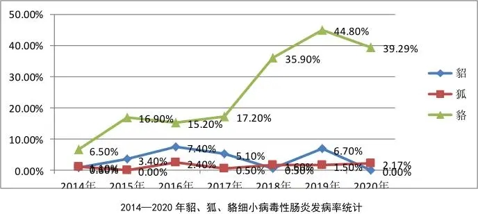 貉細小病毒性腸炎是由細小病毒引起的一種急性、烈性、接觸性病毒性傳染病,臨床以劇烈腹瀉、嘔吐、高發(fā)病率和死亡率為特征。對2014年-2020年貂、狐、貉細小病毒性腸炎各年份動物發(fā)病率進行統(tǒng)計和比較,結(jié)果發(fā)現(xiàn)水貂和狐貍細小病毒發(fā)病率在低位徘徊,貉細小病毒性腸炎不但發(fā)病率高而且2014-2020年呈明顯上升趨勢,2019年占來診貉病例的44.8%(2014-2020年貂、狐、貉細小病毒性腸炎發(fā)病率統(tǒng)計如下圖所示),給養(yǎng)殖戶帶來了巨大的損失。筆者就2021年6月份河北某貉子養(yǎng)殖場晚窩貉子因注射細小病毒性腸炎疫苗過晚而打到潛伏期后貉子的病程發(fā)展和綜合治療方案敘述如下僅供參考