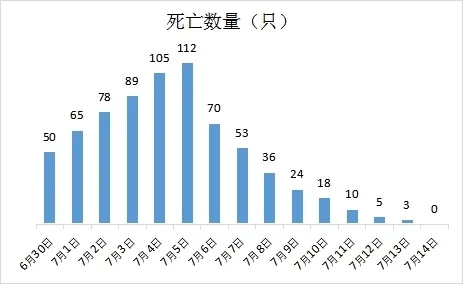 該養(yǎng)殖場夏季貉子存欄5000只,分兩批次完成夏季貉子的防疫工作,6月3日-6月5日免疫2300只早窩貉子,6月27-6月28日免疫2700只晚窩貉子。打完疫苗后的第二天晚窩貉子開始出現(xiàn)精神沉郁、采食量下降、死亡的病例,病情一直延續(xù)到15天后開始出現(xiàn)穩(wěn)定,發(fā)生病情15天內(nèi)貉子的死亡數(shù)量如下圖所示: