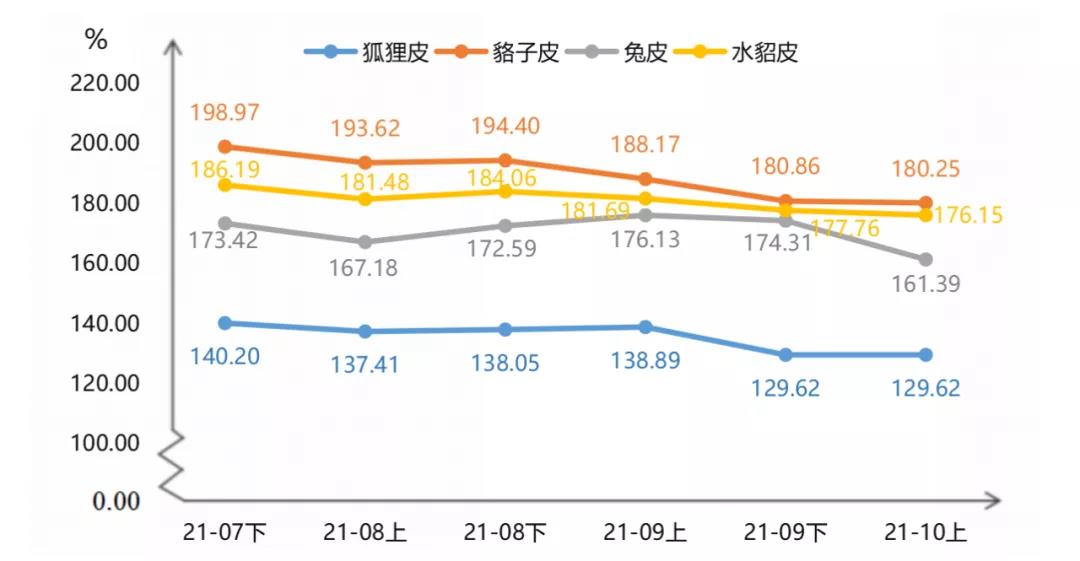 裘皮各品類產(chǎn)品價格指數(shù)中,兔皮產(chǎn)品價格指數(shù)下跌幅度較大,10月上半月價格指數(shù)收報161.39點,環(huán)比跌幅為7.41%。貉子皮和水貂皮產(chǎn)品價格10月上半月均有小幅走低,價格指數(shù)分別收報180.25點和176.15點,環(huán)比分別下滑0.34%和0.91%。10月上半月狐貍皮產(chǎn)品價格指數(shù)與上期持平,收報129.62點。