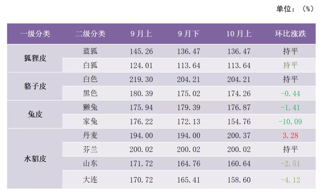 水貂皮產(chǎn)品細分品類中,進口丹麥水貂皮產(chǎn)品價格指數(shù)環(huán)比上漲,10月上半月收報200.37點,環(huán)比漲幅為3.28%,芬蘭水貂皮產(chǎn)品價格指數(shù)與上期持平,收報200.02點;國產(chǎn)山東和大連水貂皮產(chǎn)品價格指數(shù)均有所下滑,10月上半月產(chǎn)品價格指數(shù)分別收報160.64點和158.60點,環(huán)比跌幅分別為2.51%和4.12%。