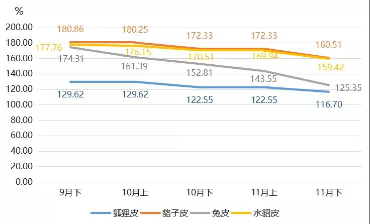 裘皮各品類產(chǎn)品價格指數(shù)中,兔皮產(chǎn)品價格指數(shù)下跌幅度最大,11月下半月收報(bào)125.35點(diǎn),環(huán)比跌幅為12.68%,是裘皮產(chǎn)品價格總指數(shù)下滑的主要原因,導(dǎo)致裘皮產(chǎn)品價格總指數(shù)下滑5.46個百分點(diǎn)。貉子皮和水貂皮產(chǎn)品價格指數(shù)均有所下跌,11月分別收報(bào)160.51點(diǎn)和159.42點(diǎn),環(huán)比分別下滑6.86%和6.19%。狐貍皮產(chǎn)品價格指數(shù)跌幅相對較小,11月下半月價格指數(shù)小幅下滑收報(bào)116.70點(diǎn),跌幅為4.77%。