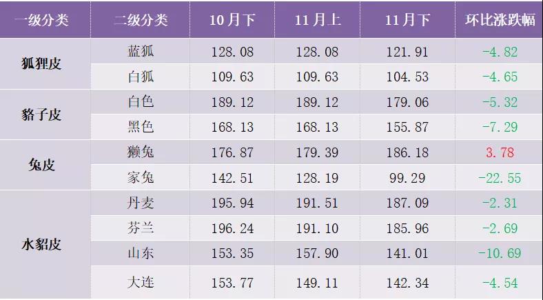 11月下半月,裘皮產(chǎn)品價格總指數(shù)持續(xù)下滑