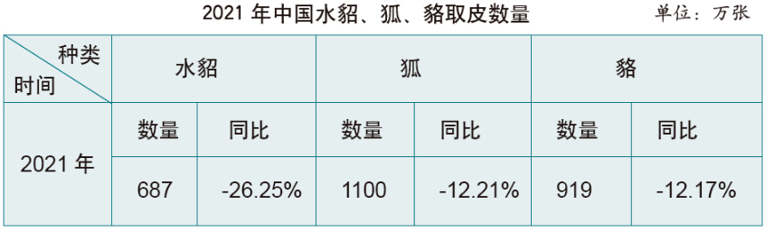 中國水貂、狐、貉取皮數(shù)量統(tǒng)計(jì)報(bào)告(2021年)
