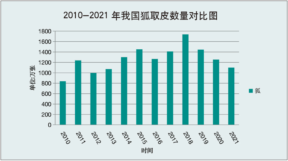2021年中國狐取皮數(shù)量1100萬張左右,與2020年統(tǒng)計(jì)數(shù)量相比減少了12.21%。從2010年到2021年取皮數(shù)量情況看,2018年以前整體呈起伏狀態(tài),2018年取皮數(shù)量達(dá)到頂峰,2018年以后出現(xiàn)連續(xù)下滑。2010-2021年中國狐取皮數(shù)量對比圖如下: