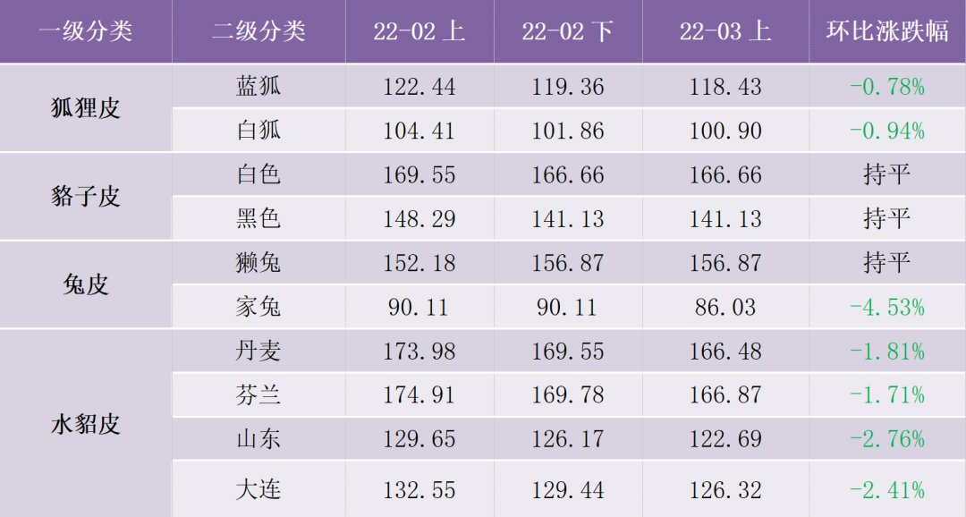2022年3月上半月,裘皮各品類細(xì)分產(chǎn)品價(jià)格指數(shù)多數(shù)下跌。具體價(jià)格指數(shù)運(yùn)行情況如表所示: