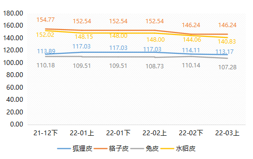 2022年3月上半月,分品類產(chǎn)品價(jià)格指數(shù)多數(shù)下滑,其中兔皮和水貂皮產(chǎn)品價(jià)格指數(shù)3月上半月分別下跌至107.28點(diǎn)和140.83點(diǎn),環(huán)比分別下滑2.86和3.23點(diǎn),其中兔皮產(chǎn)品價(jià)格指數(shù)下滑是裘皮產(chǎn)品價(jià)格總指數(shù)下滑的主要原因,導(dǎo)致總指數(shù)下滑0.86點(diǎn)。狐貍皮產(chǎn)品價(jià)格指數(shù)延續(xù)上期下滑態(tài)勢,3月上半月跌至113.17點(diǎn),環(huán)比下滑0.94點(diǎn)。貉子皮產(chǎn)品價(jià)格指數(shù)運(yùn)行穩(wěn)定,3月上半月為146.24點(diǎn),與上期持平。