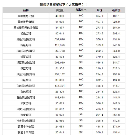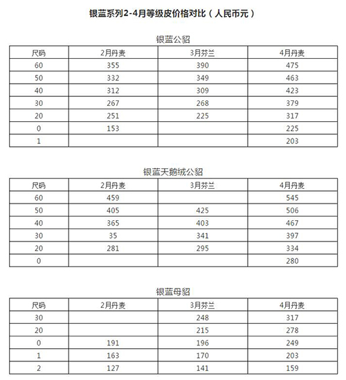 為期7天的丹麥四月線上拍賣會結(jié)束了,水貂皮的售出量近280萬張,整體價格全面上漲,上漲幅度請對比2-4月份價格。