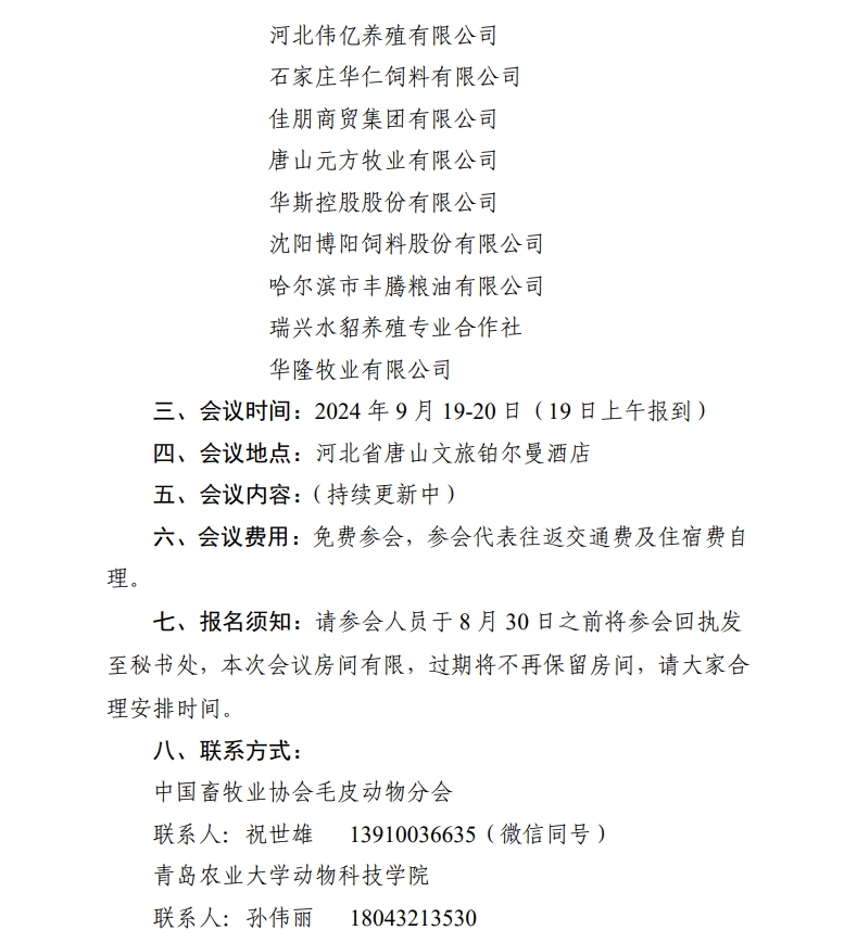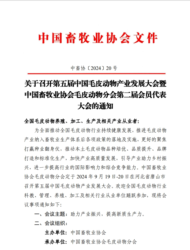 關(guān)于召開第五屆中國毛皮動(dòng)物產(chǎn)業(yè)發(fā)展大會暨中國畜牧業(yè)協(xié)會毛皮動(dòng)物分會第二屆會員代表大會的通知