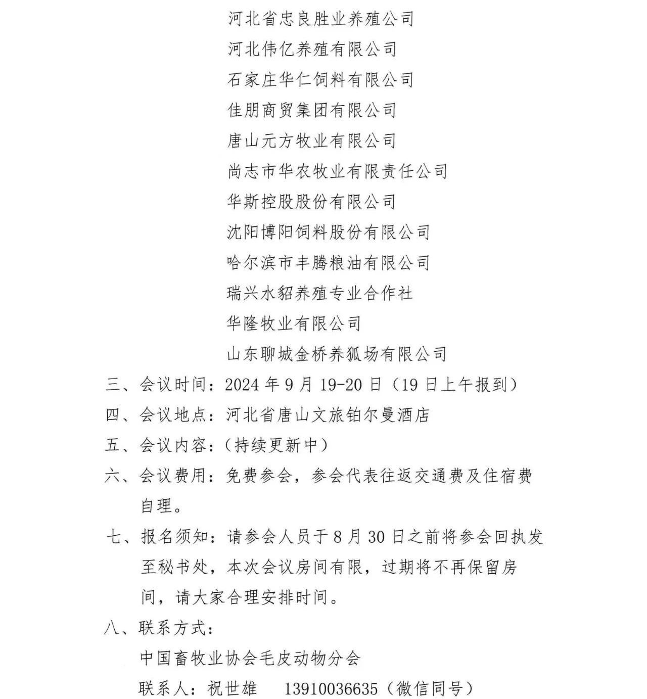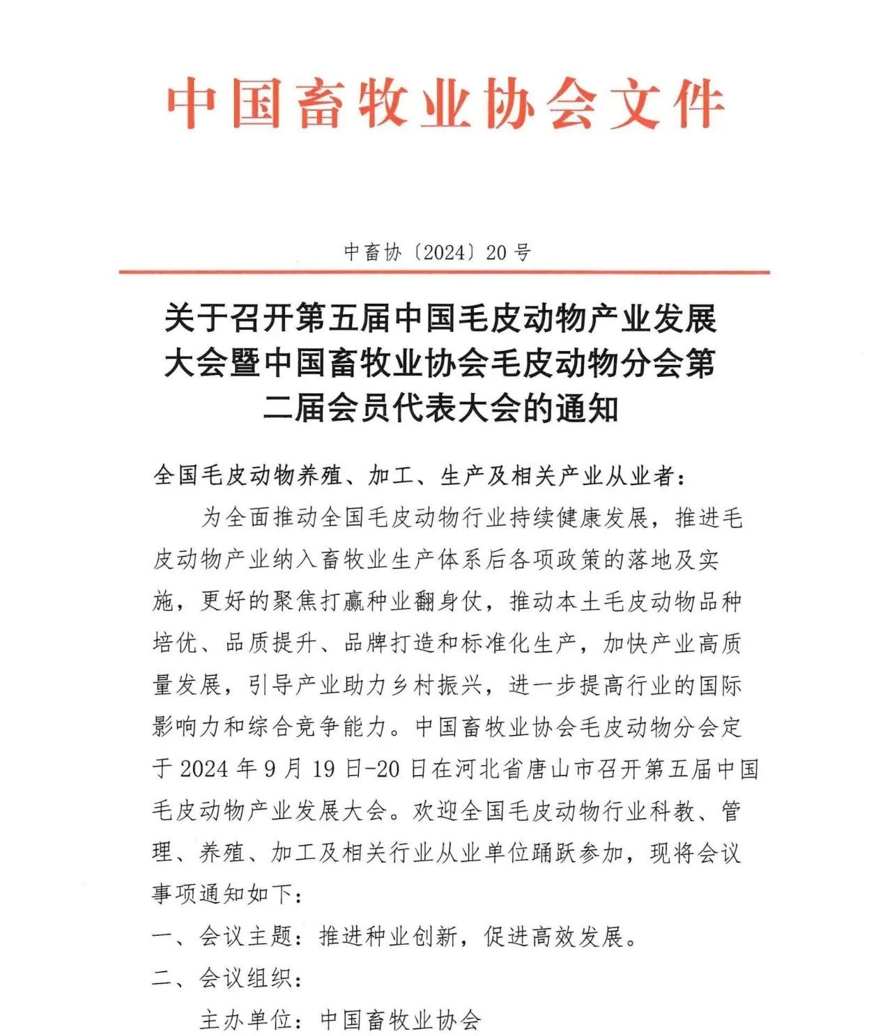 關(guān)于召開(kāi)第五屆中國(guó)毛皮動(dòng)物產(chǎn)業(yè)發(fā)展大會(huì)暨中國(guó)畜牧業(yè)協(xié)會(huì)毛皮動(dòng)物分會(huì)第二屆會(huì)員代表大會(huì)的通知