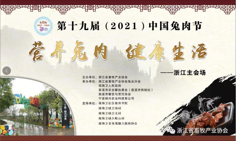 “營(yíng)養(yǎng)兔肉、健康生活”。6月6日,第十九屆(2021)中國(guó)兔肉節(jié)浙江主會(huì)場(chǎng)活動(dòng)在慈溪市鳴鶴古鎮(zhèn)廣場(chǎng)舉行。本次活動(dòng)由浙江省畜牧產(chǎn)業(yè)協(xié)會(huì)主辦,觀海衛(wèi)鎮(zhèn)人民政府、慈溪市農(nóng)合聯(lián)執(zhí)委會(huì)、慈溪市餐飲業(yè)與烹飪協(xié)會(huì)、寧波綠興農(nóng)業(yè)科技有限公司等共同承辦。