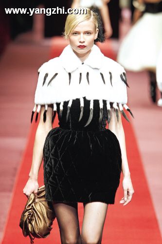 2009/2010秋冬,黑白的搭配在皮草應(yīng)用中不是大面積的,而是體現(xiàn)在點(diǎn)睛之處。對(duì)于永遠(yuǎn)都與奢華脫離不了干系的皮草,在這樣一個(gè)全球經(jīng)濟(jì)形勢(shì)下,以配件的形式出現(xiàn)或許更加適合。白色的服裝搭配黑色的皮草領(lǐng)子是最簡(jiǎn)單且最經(jīng)典的方式。白色雙排扣大衣帶給人們回到上世紀(jì)60年代的經(jīng)典感受,而黑色狐貍領(lǐng)的點(diǎn)綴讓經(jīng)典中跳躍出一抹21世紀(jì)的新鮮感。同樣,黑色小禮服是晚會(huì)中最安全的服飾,而搭配上一款白色的皮草披肩,則會(huì)讓平淡的安全變得時(shí)尚。同樣,簡(jiǎn)約的黑色皮草圍巾與襯衫搭配,展現(xiàn)了一種中性化的性感。