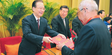 溫家寶為先進單位和先進個人代表頒獎 新華社記者 謝環(huán)馳 攝 12月26日,國務院在北京人民大會堂隆重舉行全國糧食生產表彰獎勵大會。中共中央政治局常委、國務院總理溫