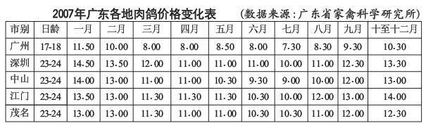 2007年廣東各地肉鴿價(jià)格變化表 (數(shù)據(jù)來(lái)源:廣東省家禽科學(xué)研究所)