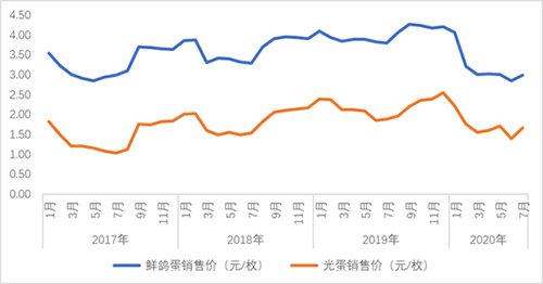 7月份,鴿蛋價格為2.99元/枚,環(huán)比上漲5%,同比下降21%。從季節(jié)性看,高溫期鴿蛋價格低迷,但后續(xù)價格會有所回升。