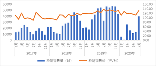 7月份,種鴿企業(yè)青年鴿的銷量大幅增長,環(huán)比增加約2倍,同比增加22%。從季節(jié)性看,三季度普遍存在種鴿銷量增長的情況。價格方面,種鴿平均售價達到132元/對,環(huán)比上漲16.8%,并接近去年同期水平??傮w判斷,三季度種鴿的市場已經恢復到新冠肺炎疫情以前的水平。從結構上看,此次種鴿銷量增長為普遍現(xiàn)象。價格上,最低價為每對54元,最高為210元。