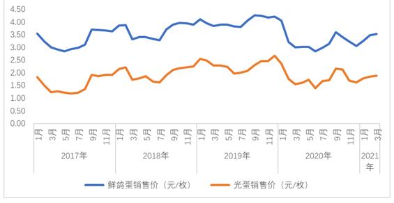 3月份,監(jiān)測企業(yè)鮮鴿蛋價格回調至3.52元/枚,光蛋增至1.88元/枚,增幅分別為2%和1%。從結構上看,仍有不少企業(yè)鴿蛋價格下調,且鮮鴿蛋最低價調至2.2元/枚;最高價為5元/枚。