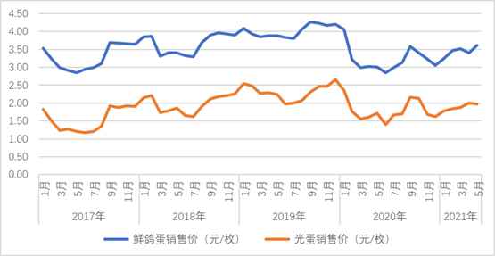 5月份監(jiān)測企業(yè)鴿蛋平均價格為3.61元/枚,光蛋價格1.97元/枚。從結(jié)構(gòu)上看,也是下調(diào)的企業(yè)居多,最低價為1.9元/枚,光蛋最低價為0.9元/枚。