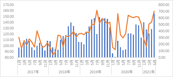 種鴿銷售指數(shù)為694,環(huán)比增加61%,種鴿銷售向好。從結(jié)構(gòu)看,多數(shù)企業(yè)種鴿銷量環(huán)比增加較快,僅少數(shù)企業(yè)種鴿銷量下滑,因此整體上仍然是增加的。價格方面,調(diào)整后的平均價格為159元/對,環(huán)比增加19%。從結(jié)構(gòu)看,大部分企業(yè)價格維穩(wěn),下調(diào)和上調(diào)的企業(yè)數(shù)量相當(dāng),也表現(xiàn)極大的差異。最低價為45元/對,最高價為230元/對,不同的品種和月齡的種鴿價格差異較大。整體上看,5月份,種鴿市場量價齊增,表現(xiàn)較好。