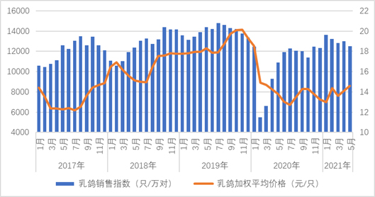 與種鴿的市場表現(xiàn)不同,乳鴿市場仍然持續(xù)低迷。銷售指數(shù)下調(diào)到12479,鴿場走貨能力比去年同期要好很多,但相比2017-2019年,表現(xiàn)一般。從結(jié)構(gòu)看,乳鴿銷量下滑的企業(yè)比增長的企業(yè)數(shù)量略多,但差距不大。價格方面,乳鴿加權(quán)平均價格仍在14元/只上下微調(diào),本期增加到14.6元/只,環(huán)比增加3.44%。但從結(jié)構(gòu)上看,在價格波動的企業(yè)中,價格下調(diào)的企業(yè)數(shù)量較多,最低價仍為10元/只,且乳鴿也進(jìn)入了季節(jié)周期,價格很難顯著地反彈回升。